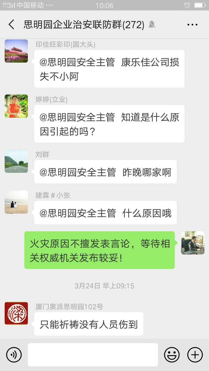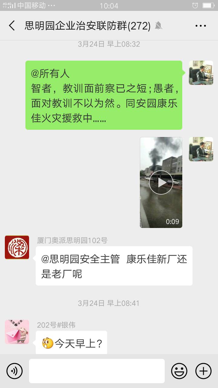 2019年3月24日8:30許,位于我司園區(qū)周邊的同安工業(yè)集中區(qū)同安園康樂佳公司發(fā)生火災(zāi)。為了給園區(qū)內(nèi)企業(yè)敲響警鐘,全和物業(yè)集中區(qū)思明園服務(wù)處在轄區(qū)“企業(yè)業(yè)主治安聯(lián)防微信群”里即時發(fā)布現(xiàn)場火災(zāi)視頻動態(tài)信息,以“微信現(xiàn)場會”的形式提醒轄區(qū)企業(yè)業(yè)主“提高消防意識,加強(qiáng)防火墻建設(shè)”。