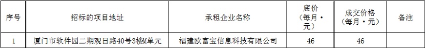 根據(jù)思明區(qū)國有企業(yè)資產(chǎn)出租管理的相關制度,我司2019年4月22日上午9:00于觀音山營運中心2號樓2層2號會議室進行公開招租現(xiàn)場開標,現(xiàn)通過思明控股網(wǎng)站對外發(fā)布成交公告,內(nèi)容如下: