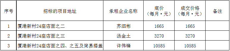 根據(jù)思明區(qū)國(guó)有企業(yè)資產(chǎn)出租管理的相關(guān)制度,我司2019年5月28日上午9:00起于觀音山營(yíng)運(yùn)中心2號(hào)樓2層2號(hào)會(huì)議室進(jìn)行公開(kāi)招租現(xiàn)場(chǎng)開(kāi)標(biāo),現(xiàn)通過(guò)思明控股網(wǎng)站對(duì)外發(fā)布成交公告,內(nèi)容如下: