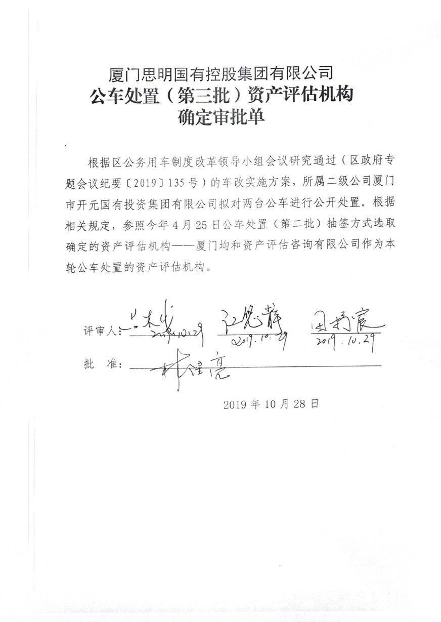 根據(jù)廈門市思明區(qū)人民政府關(guān)于區(qū)屬國企車改實施方案專題會議紀(jì)要(〔2019〕135號)及思明控股《關(guān)于落實車改實施方案相關(guān)事宜的通知》(思明控股辦〔2019〕9號)文的相關(guān)精神。我司委托廈門均和房地產(chǎn)土地評估咨詢有限公司對公車處置(第三批)的資產(chǎn)進行評估,該公司已向我司提交資產(chǎn)評估結(jié)果初稿?,F(xiàn)將評估結(jié)果進行公示,如有異議,歡迎來電來函反映。
