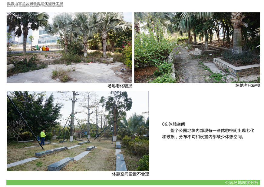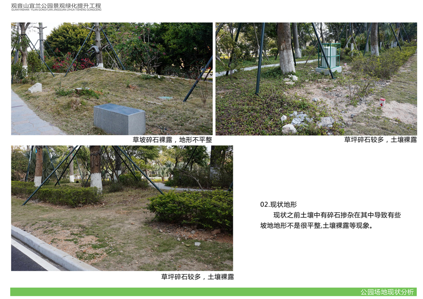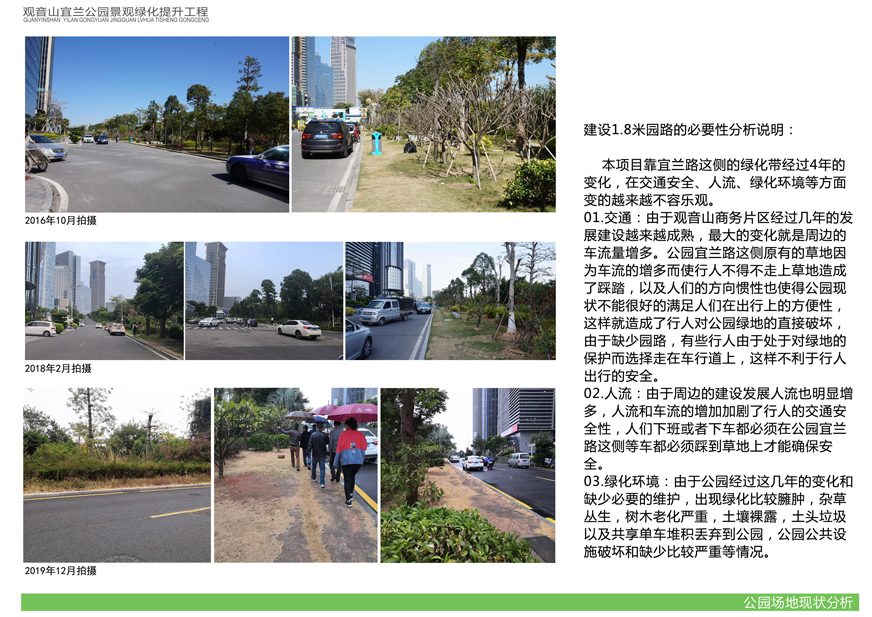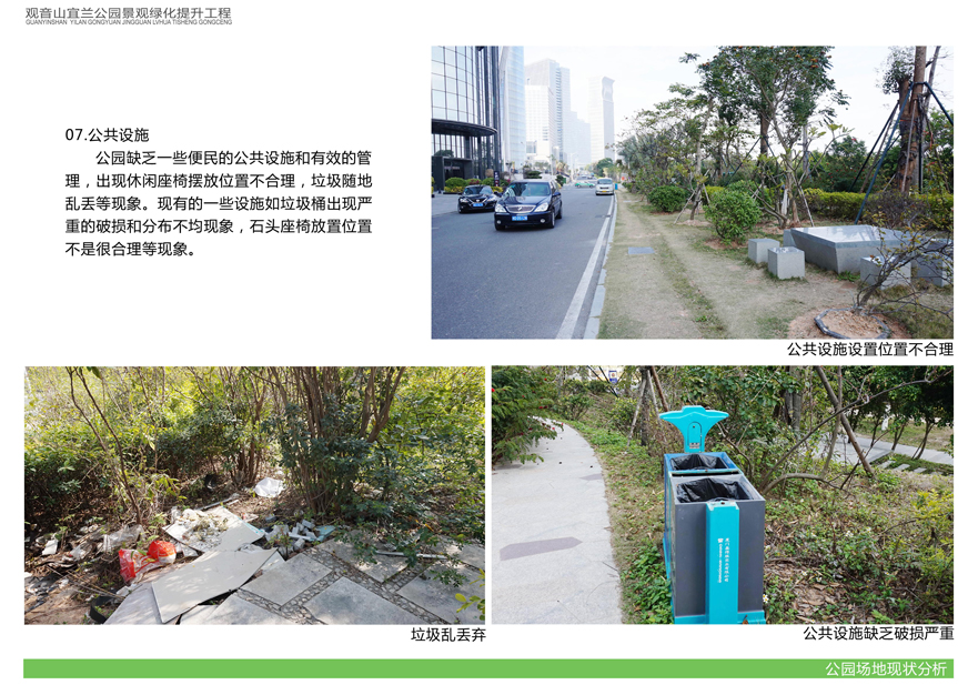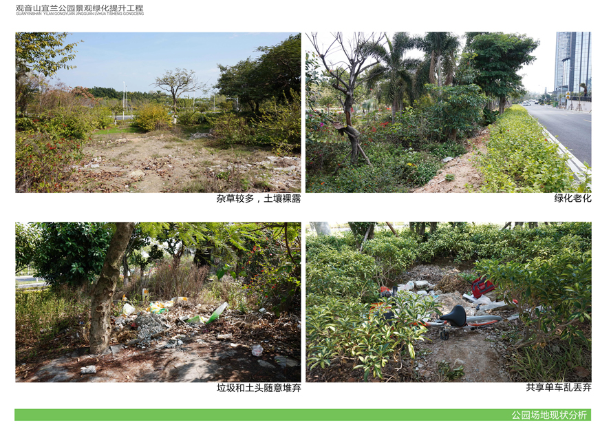 項目位于環(huán)島東路與觀音山商務(wù)營運(yùn)中心之間,緊鄰城市干道環(huán)島東路及市政道路宜蘭路。該區(qū)域景觀綠化目前存在植被缺少后期養(yǎng)護(hù),雜草較多,并出現(xiàn)倒伏現(xiàn)象,影響人行交通;各類設(shè)施老化,景觀帶內(nèi)垃圾無人清除,造成環(huán)境污染;區(qū)域兩側(cè)靠近車行道,缺少必要的人行園路,安全性較差;配套設(shè)施不完善,澆灌系統(tǒng)布局不合理等問題,嚴(yán)重影響城市形象,因此對現(xiàn)狀綠化進(jìn)行整治十分必要。