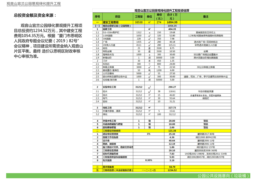 觀音山宜蘭公園景觀綠化提升工程由我司下屬廈門市開元國有投資集團(tuán)有限公司負(fù)責(zé)建設(shè),項目投資估算為1234.52萬元。