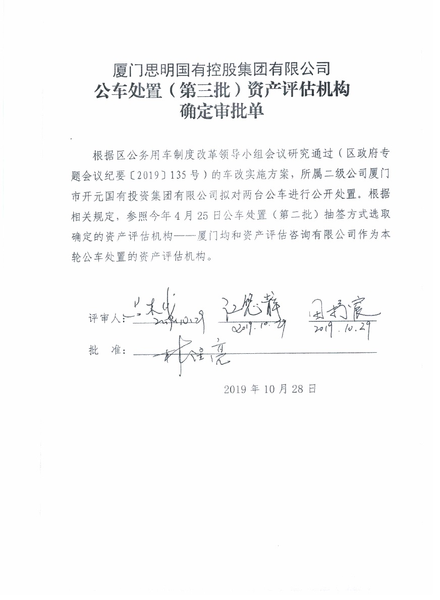 根據(jù)廈門(mén)市思明區(qū)人民政府關(guān)于區(qū)屬?lài)?guó)企車(chē)改實(shí)施方案專(zhuān)題會(huì)議紀(jì)要(〔2019〕135號(hào))及思明控股《關(guān)于落實(shí)車(chē)改實(shí)施方案相關(guān)事宜的通知》(思明控股辦〔2019〕9號(hào))文的相關(guān)精神。我司委托廈門(mén)均和房地產(chǎn)土地評(píng)估咨詢(xún)有限公司對(duì)公車(chē)處置(第三批)的資產(chǎn)進(jìn)行評(píng)估,該公司已向我司提交資產(chǎn)評(píng)估結(jié)果初稿?,F(xiàn)將評(píng)估結(jié)果進(jìn)行公示,如有異議,歡迎來(lái)電來(lái)函反映。