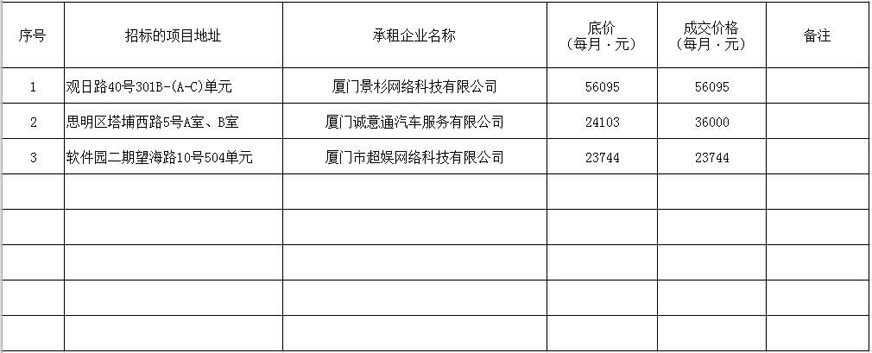 根據(jù)思明區(qū)國(guó)有企業(yè)資產(chǎn)出租管理的相關(guān)制度,我司2020年4月9日上午9:00起于觀音山營(yíng)運(yùn)中心2號(hào)樓2層2號(hào)會(huì)議室進(jìn)行公開(kāi)招租現(xiàn)場(chǎng)開(kāi)標(biāo),現(xiàn)通過(guò)思明控股網(wǎng)站對(duì)外發(fā)布成交公告,內(nèi)容如下:
