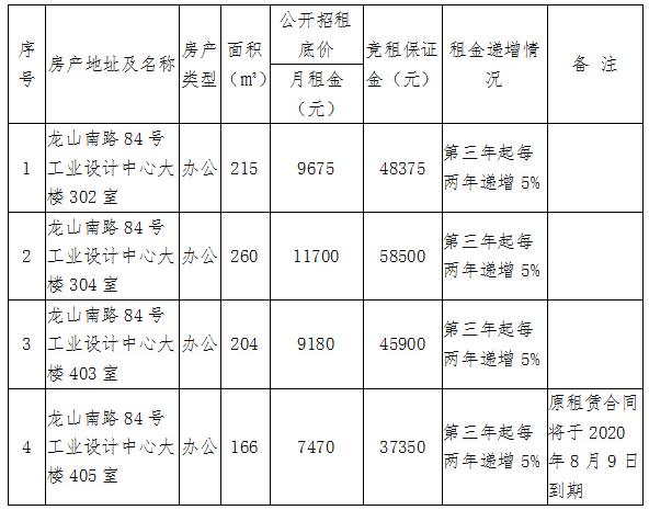 根據(jù)國有企業(yè)資產(chǎn)出租管理相關制度,我司決定對位于思明區(qū)龍山南路84號工業(yè)設計中心3至4層房產(chǎn)對符合入駐條件的意向承租人進行公開競價招租,具體信息如下: