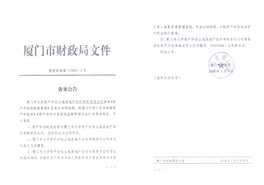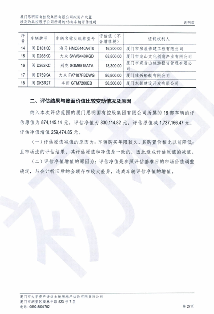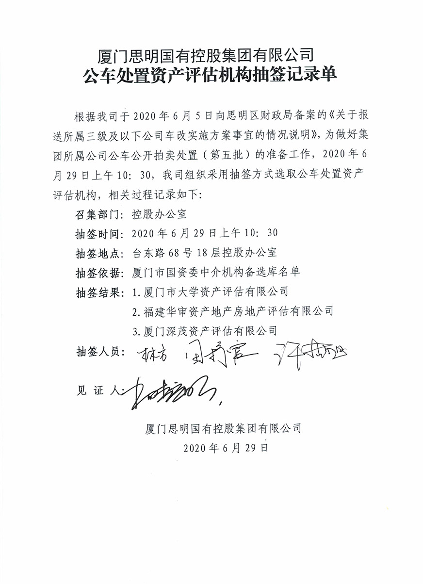 根據(jù)2020年6月5日我司報經(jīng)思明區(qū)財政局批準備案的《關于報送所屬三級及以下公司車改實施方案事宜的情況說明》相關文件精神,我司委托廈門市大學資產(chǎn)評估土地房地產(chǎn)估價有限責任公司對公車處置(第五批)的車輛進行評估,該公司已于9月30日向我司提交資產(chǎn)評估結果初稿?,F(xiàn)將評估結果進行公示,如有異議,歡迎來電來函反映。