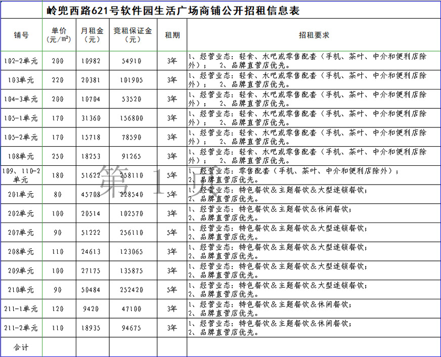 招租要求:詳見(jiàn)附表(軟件園生活廣場(chǎng)公開(kāi)招租信息表)