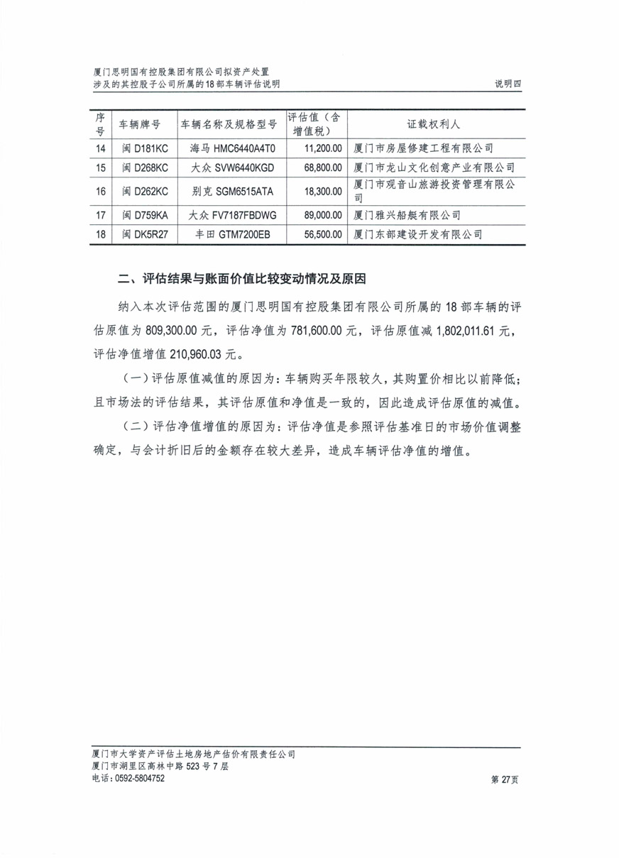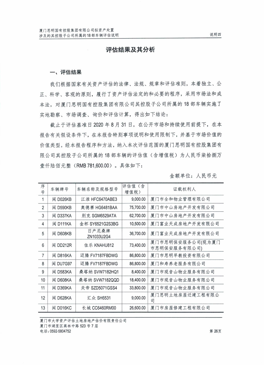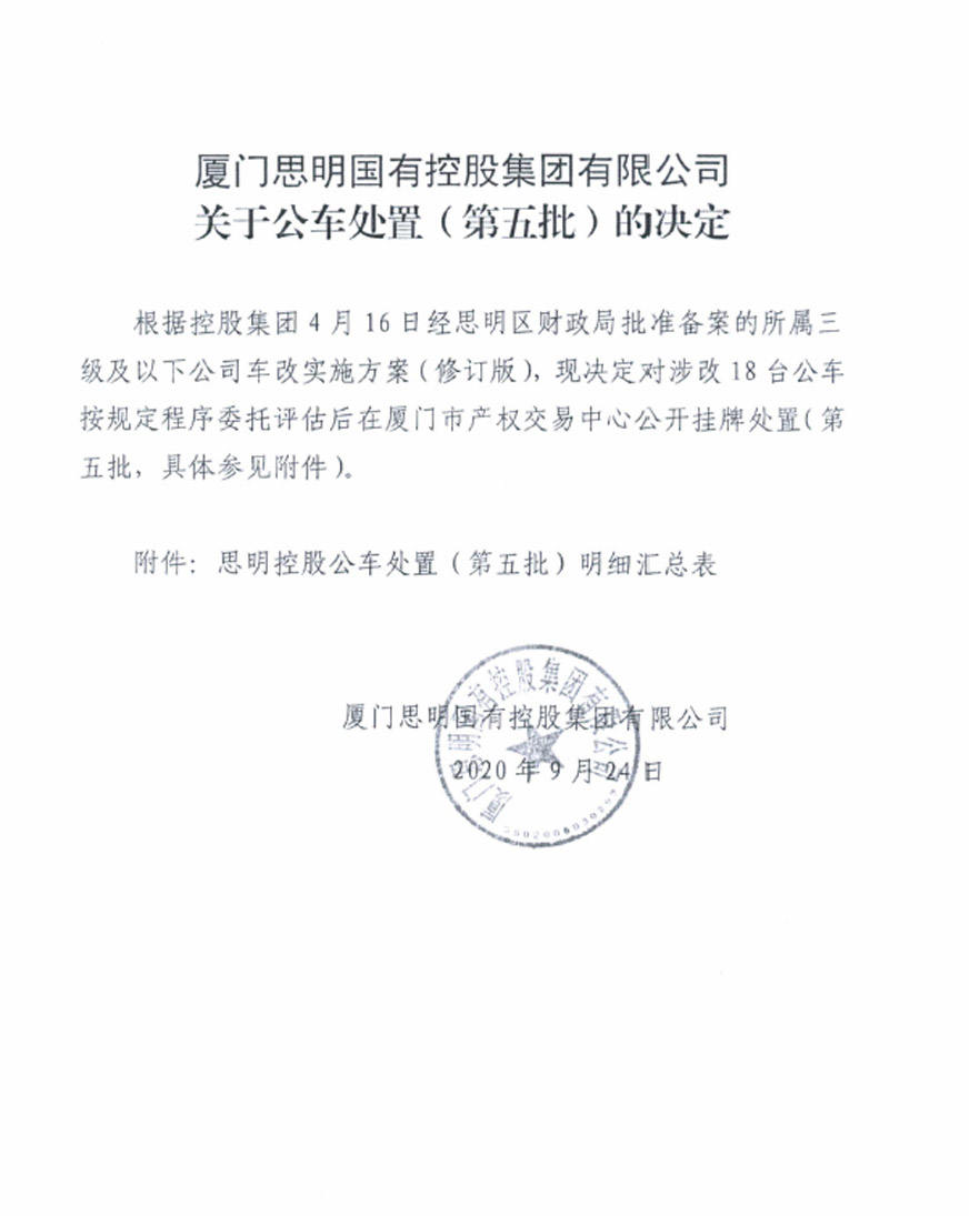 根據(jù)2020年6月5日我司報(bào)經(jīng)思明區(qū)財(cái)政局批準(zhǔn)備案的《關(guān)于報(bào)送所屬三級(jí)及以下公司車改實(shí)施方案事宜的情況說明》相關(guān)文件精神,我司委托廈門市大學(xué)資產(chǎn)評(píng)估土地房地產(chǎn)估價(jià)有限責(zé)任公司對(duì)公車處置(第五批)的車輛進(jìn)行評(píng)估,該公司已于11月10日向我司提交資產(chǎn)評(píng)估結(jié)果。現(xiàn)將評(píng)估結(jié)果進(jìn)行公示,如有異議,歡迎來電來函反映。