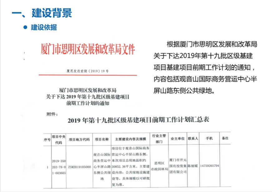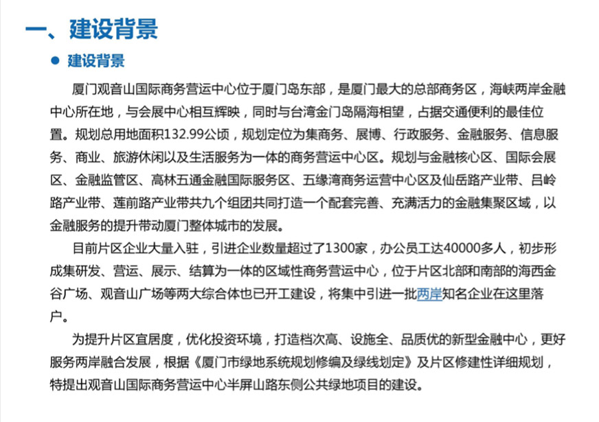 觀音山片區(qū)作為兩岸金融中心片區(qū)重要組成部分,公共綠地建設(shè)、養(yǎng)護水平的高低關(guān)系到兩岸金融中心建設(shè)的品質(zhì)。為提升片區(qū)景觀形象,優(yōu)化投資環(huán)境,根據(jù)《廈門市綠地系統(tǒng)規(guī)劃修編及綠線劃定》及片區(qū)修建性詳細規(guī)劃,廈門市開元國有投資集團有限公司擬建設(shè)觀音山國際商務(wù)營運中心半屏山路東側(cè)公共綠地項目,并委托上海東方設(shè)計研究院進行了方案設(shè)計。根據(jù)廈府辦[2019]115號文要求,現(xiàn)將設(shè)計方案予以公布并廣泛征求意見。