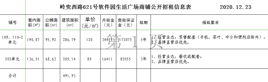 6、競(jìng)租保證金:詳見附表(軟件園生活廣場(chǎng)公開招租信息表)。