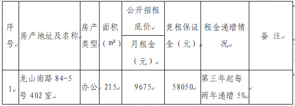 根據(jù)國有企業(yè)資產(chǎn)出租管理相關(guān)制度,我司決定對位于龍山南路84-5號402室房產(chǎn)對符合入駐條件的意向承租人進(jìn)行公開競價招租,具體信息如下: