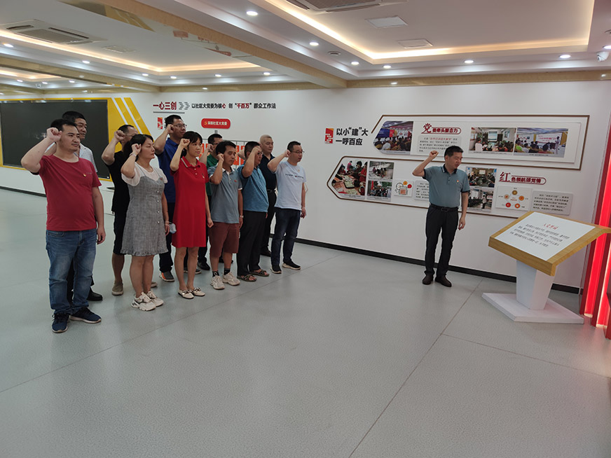 隨著參觀接近尾聲時,在這重要的時刻,重要的地點,黨支部書記陳睿武帶領大家,面向黨旗,莊嚴地舉起右手,握拳宣誓,重溫入黨誓詞:“我志愿加入中國共產(chǎn)黨,擁護黨的綱領,遵守黨的章程,履行黨員義務,執(zhí)行黨的決定,嚴守黨的紀律,保守黨的秘密,對黨忠誠,積極工作……”短短的80個字,句句千鈞、擲地有聲,讓全體黨員再次接受洗禮,銘記莊嚴的承諾,牢記共產(chǎn)黨員的初心和使命,堅定對黨的事業(yè)奮斗終生的決心。參觀結束后,大家也紛紛表示將會從深田社區(qū)的紅色印記中汲取力量,牢記初心使命,以更飽滿的熱情積極投身到工作中去,切實發(fā)揮黨員的先鋒模范作用,為企業(yè)的發(fā)展添磚加瓦。