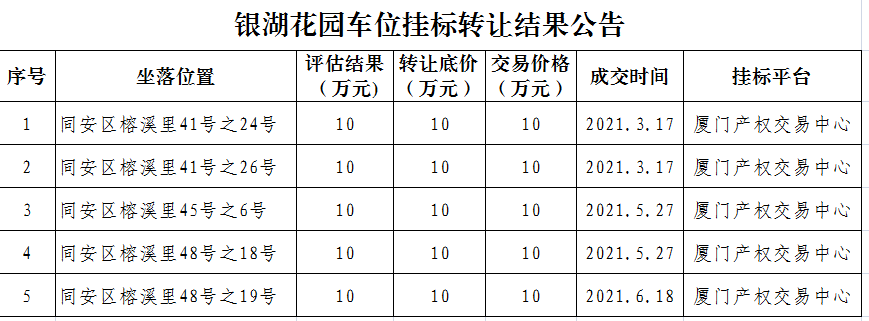 根據思明區(qū)國有企業(yè)資產管理的相關制度,我公司在廈門產權交易中心對銀湖花園5個車位(車位信息詳見下表)進行公開資產掛牌轉讓。截止2021年6月25日,5個車位全部完成交易。現通過思明控股網站對外發(fā)布成交公告,內容如下: