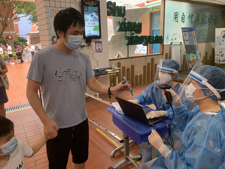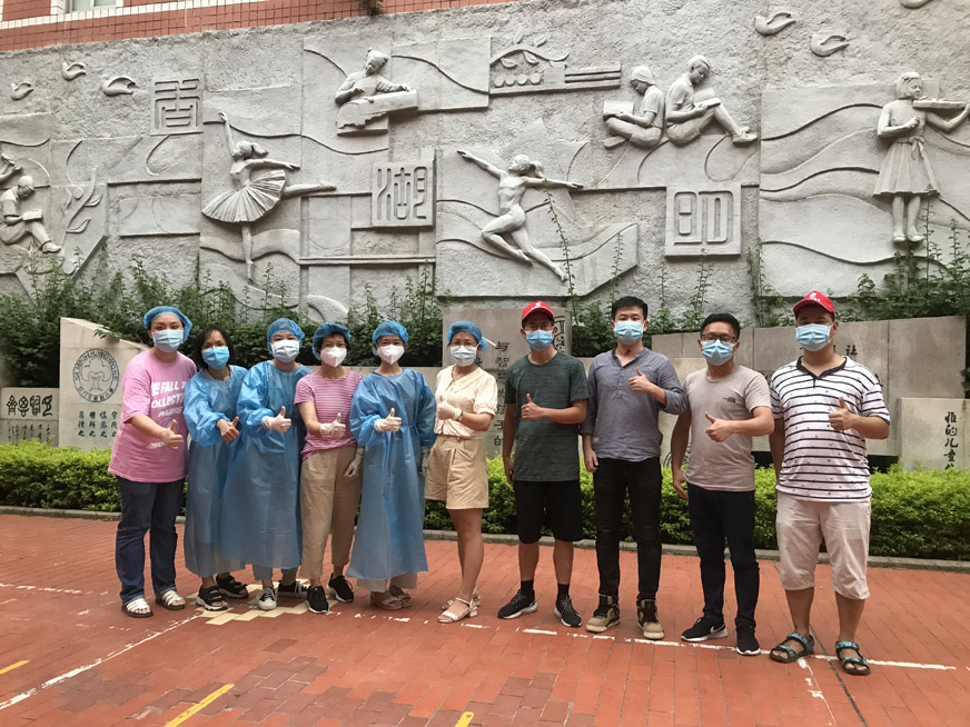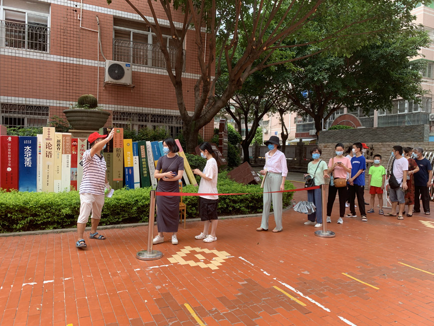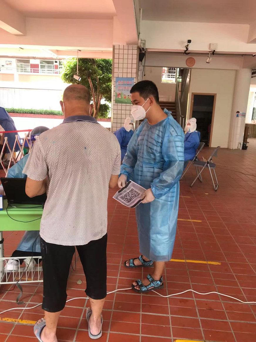 盡管隊(duì)員們幾乎徹夜未眠,31日清晨7點(diǎn),湖明小學(xué)門口,全和第一支抗疫志愿者隊(duì)伍10人全部準(zhǔn)時(shí)集結(jié)到位。在領(lǐng)隊(duì)招商部經(jīng)理邱慧瓊的帶領(lǐng)下,主動(dòng)對(duì)接街道社區(qū)工作人員,領(lǐng)取工作任務(wù)。很快,隊(duì)員們各就各位、迅速上崗,與醫(yī)務(wù)人員、社區(qū)工作人員擰成一股繩:測(cè)量體溫、維持秩序;指引登記、答疑解惑;上門動(dòng)員、分批引導(dǎo),登記錄入,面對(duì)不會(huì)用手機(jī)預(yù)約的老人、預(yù)約條形碼不規(guī)范的群眾,隊(duì)員們細(xì)致耐心地指導(dǎo)、不厭其煩地重復(fù)答疑,用微笑化解疫情之下群眾的焦躁心情,全力協(xié)助核酸檢測(cè)工作,用實(shí)際行動(dòng)踐行國(guó)企擔(dān)當(dāng)。