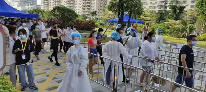 在支援的過程中,他們的額頭、臉部、手腕出現(xiàn)了深深的勒痕,甚至有志愿者出現(xiàn)了中暑虛脫的癥狀,卻仍然頑強地堅守著。直到第二輪、第三輪核酸檢測,他們依舊聞令而動,主動請纓,沖鋒在前。