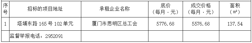 根據(jù)思明區(qū)國(guó)有企業(yè)資產(chǎn)出租管理的相關(guān)制度,我司2021年8月13日上午9:00起于觀音山營(yíng)運(yùn)中心7號(hào)樓2層會(huì)議室進(jìn)行公開招租現(xiàn)場(chǎng)開標(biāo),現(xiàn)通過思明控股網(wǎng)站對(duì)外發(fā)布成交公告,內(nèi)容如下: