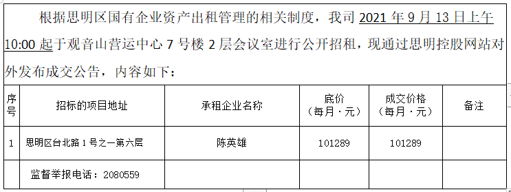 關(guān)于思明區(qū)臺北路1號之一第六層公開招租的成交公告
