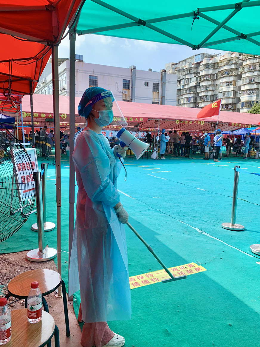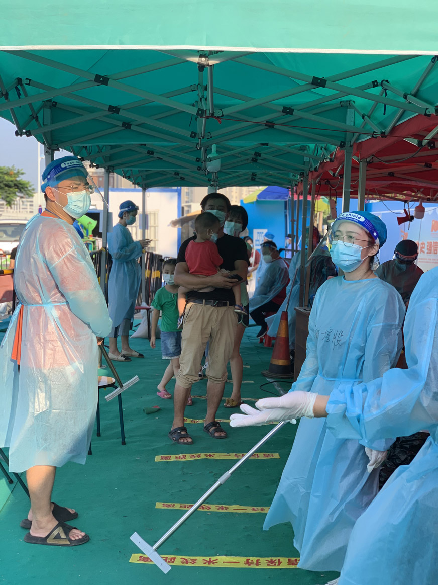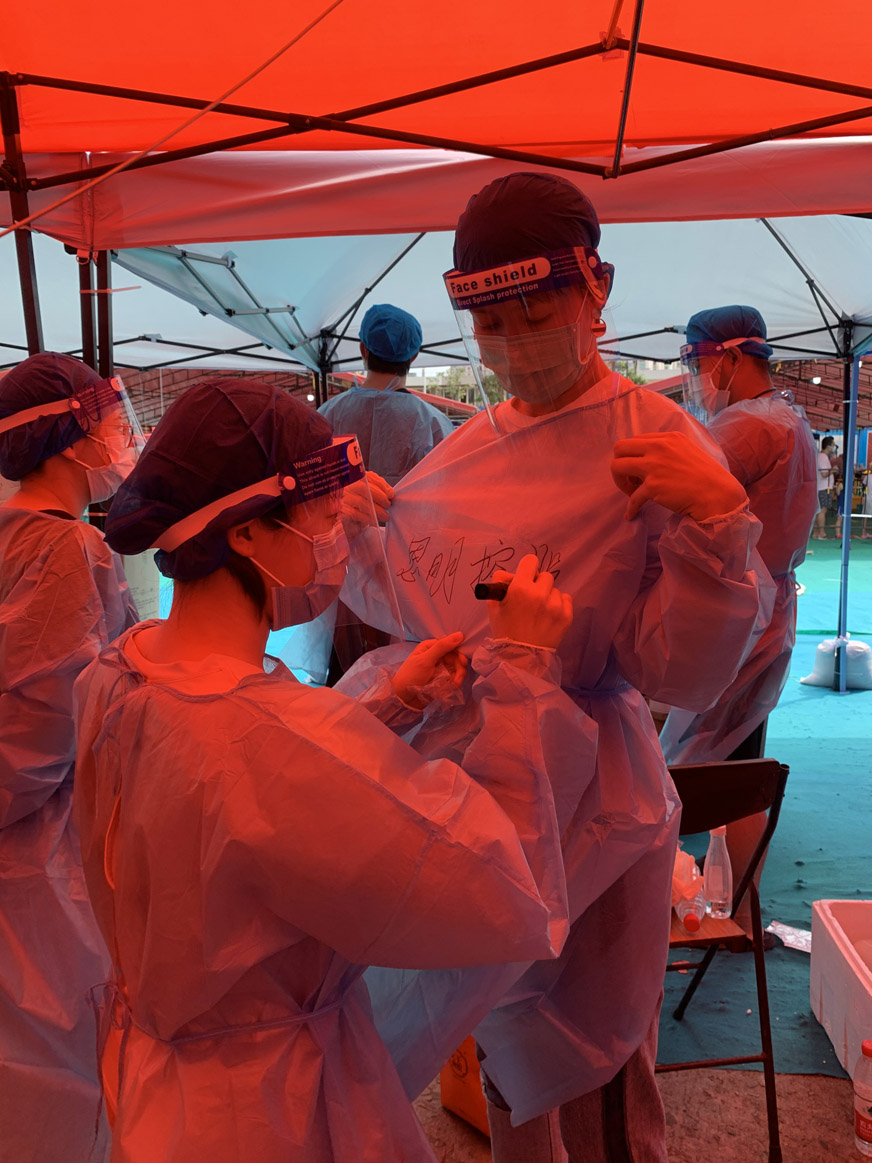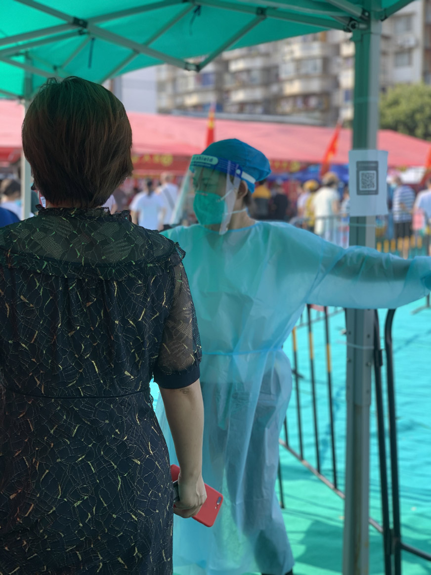 下午兩點,作為志愿二組,和一組同事做好交接工作的我們,換上隔離防護裝備,開啟了檢測點下午場的秩序維護工作。