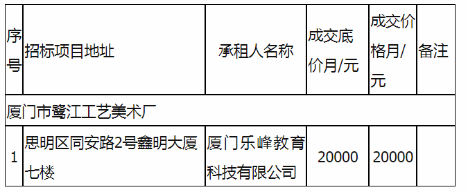 根據(jù)思明區(qū)國有企業(yè)資產(chǎn)出租管理的相關(guān)制度,我司2021年10日上午9:00起于廈門市思明區(qū)觀音山國際商務(wù)營運(yùn)中心2樓2層2會(huì)議室進(jìn)行公開招標(biāo)現(xiàn)場開標(biāo),現(xiàn)通過思明控股網(wǎng)站對外發(fā)布成交公告,內(nèi)容如下: