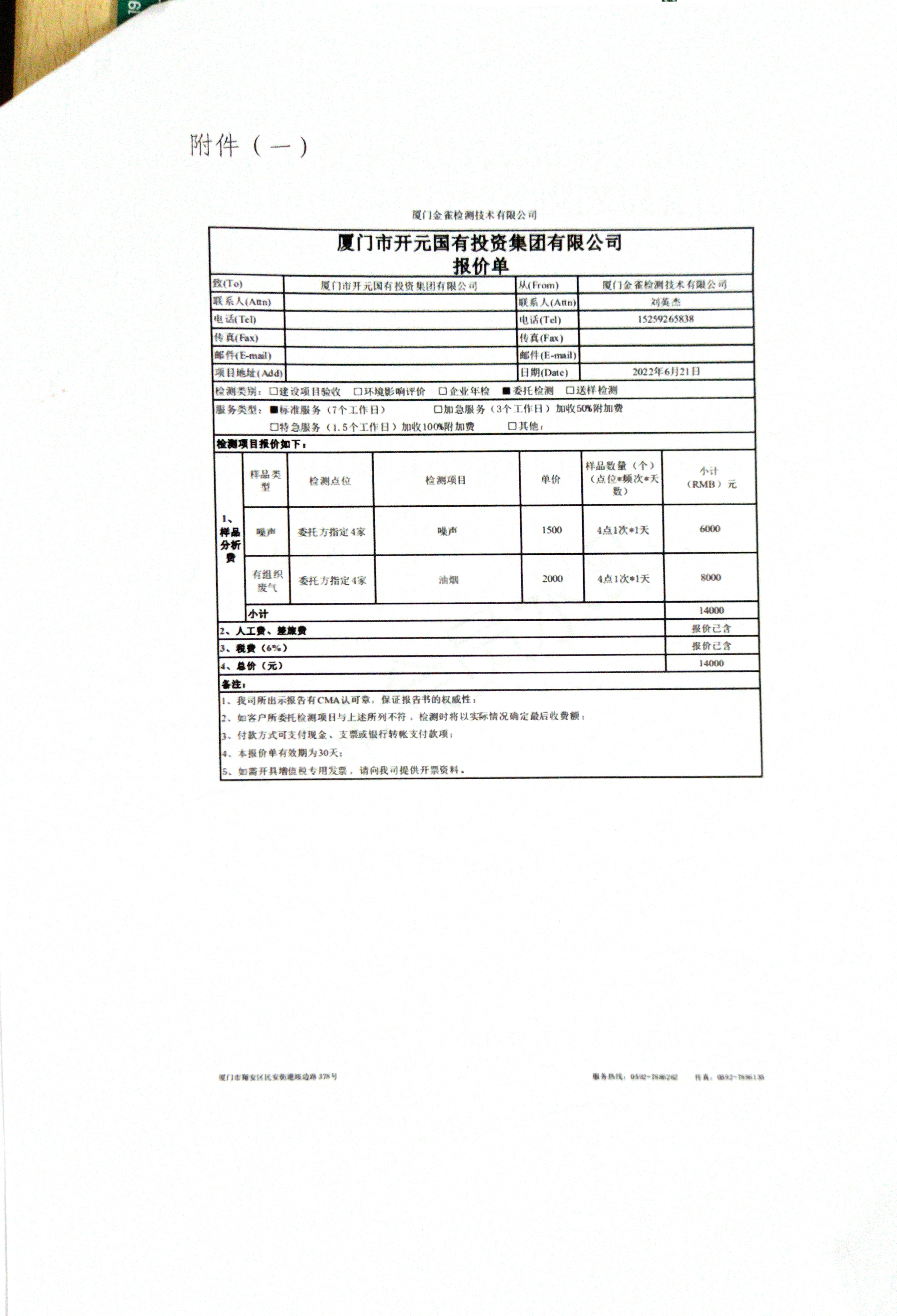 檢測費用總價款為人民幣壹萬肆仟元整(¥:14000元),報價單詳見附件(一)。
