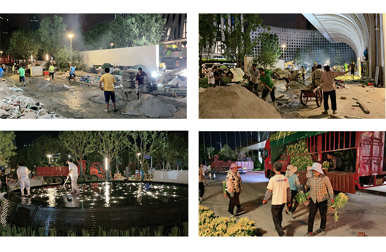 讓我們把時(shí)針撥回9月6日晚,距離第二屆海絲中央法務(wù)區(qū)論壇開(kāi)幕僅剩不到12小時(shí),現(xiàn)場(chǎng)還有大量的收尾工作需要完成??毓杉瘓F(tuán)兩位主要領(lǐng)導(dǎo)統(tǒng)籌指揮部署,副總工程師蔡泓、項(xiàng)目分管領(lǐng)導(dǎo)何清成、觀音山物業(yè)海西金谷廣場(chǎng)服務(wù)處主任陳文忠等一線干部職工連續(xù)多日通宵奮戰(zhàn),所屬公司參戰(zhàn)力量精銳匯聚。華燈閃爍,機(jī)器轟鳴,車輛穿梭,工人如織,所有參戰(zhàn)干部職工精神抖擻,忙碌有序,支撐下架、石材鋪設(shè)、綠植擺放、土頭清運(yùn)、衛(wèi)生保潔…通過(guò)通宵作戰(zhàn),幾個(gè)小時(shí)前的工地完成了華麗變妝,迎著仲秋和煦的晨光,步履輕盈朝著參加盛會(huì)的嘉賓款款走來(lái)。