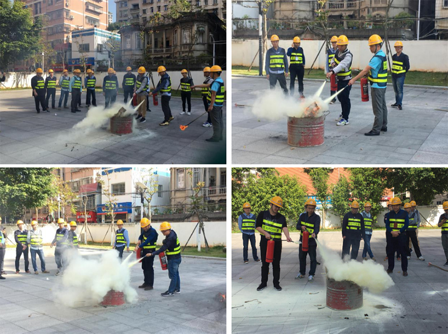演練開始,首先是對干粉滅火器的操作使用,隊(duì)員們采取兩兩分組,搖瓶,除封,拔銷,滅火,沉著冷靜,有條不紊,基本做到一次性完成滅火任務(wù),這對于平時很少實(shí)戰(zhàn)經(jīng)驗(yàn)的員工來說實(shí)屬難得。