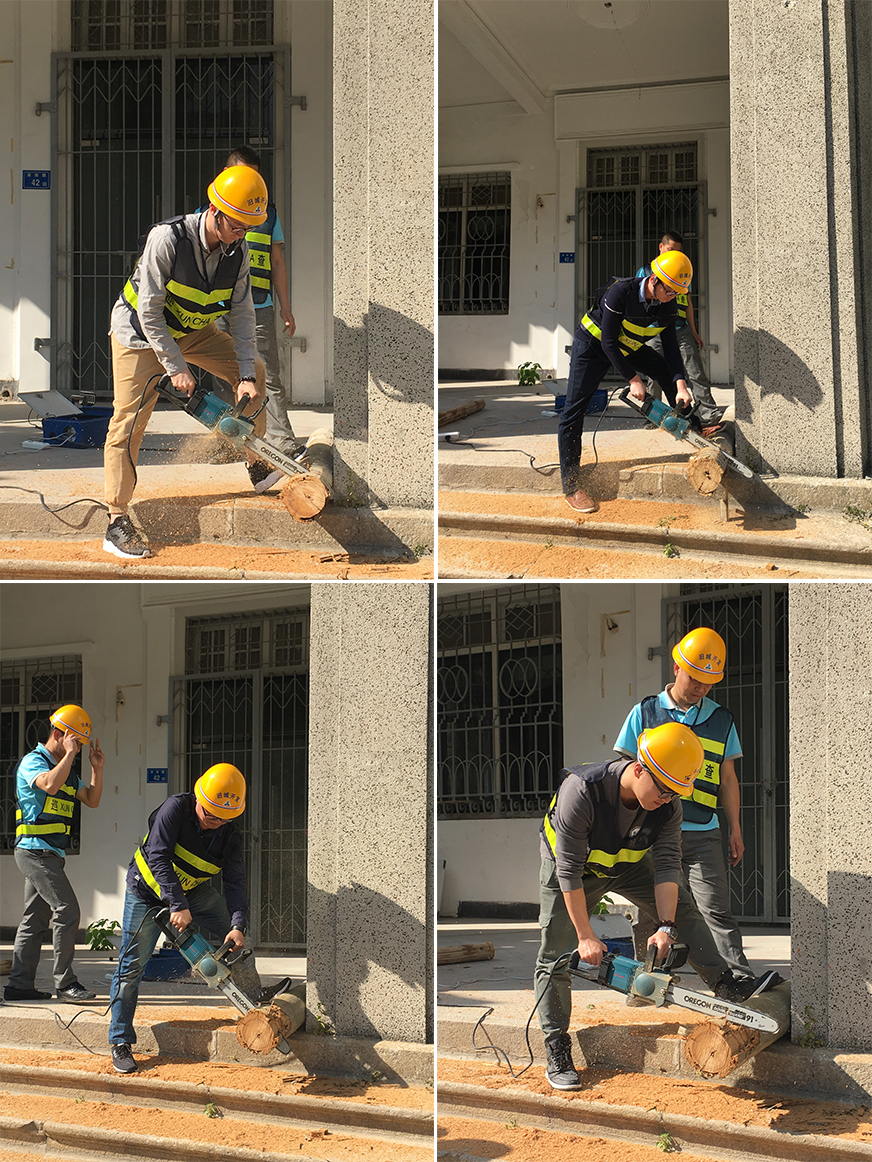 在應(yīng)急搶險器材中電鋸的操作演練環(huán)節(jié),隊(duì)員們整齊有序,一個接一個,沒有過關(guān)主動再操作一次,一轉(zhuǎn)眼功夫,一塊大長條的原木被隊(duì)員們像切白蘿卜般輕輕松松一塊塊分身落地,場地響起雷鳴般的掌聲。