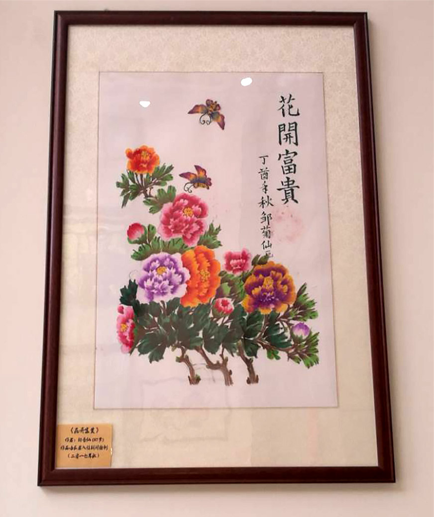一幅幅栩栩如生的美麗書畫作品,展現(xiàn)在1樓大廳顯眼的位置,給整個公寓增添了幾分生氣。走進(jìn)一看,有鄒菊仙奶奶的芬芳引蝶花開富貴牡丹,有98歲陳周光爺爺?shù)脑佀梢约懊坊ㄏ阕钥?/span>寒來作品,有80歲楊婉瑩奶奶的書法作品九成宮醴泉銘,還有汪建榮爺爺?shù)臅ㄉ鐣髁x價值觀.....這幾位爺爺奶奶看到自己的書畫作品展示在公寓展示欄里,甚是欣喜和滿足,他們也成為了我們源泉山莊老年公寓的小有名氣的書畫家。